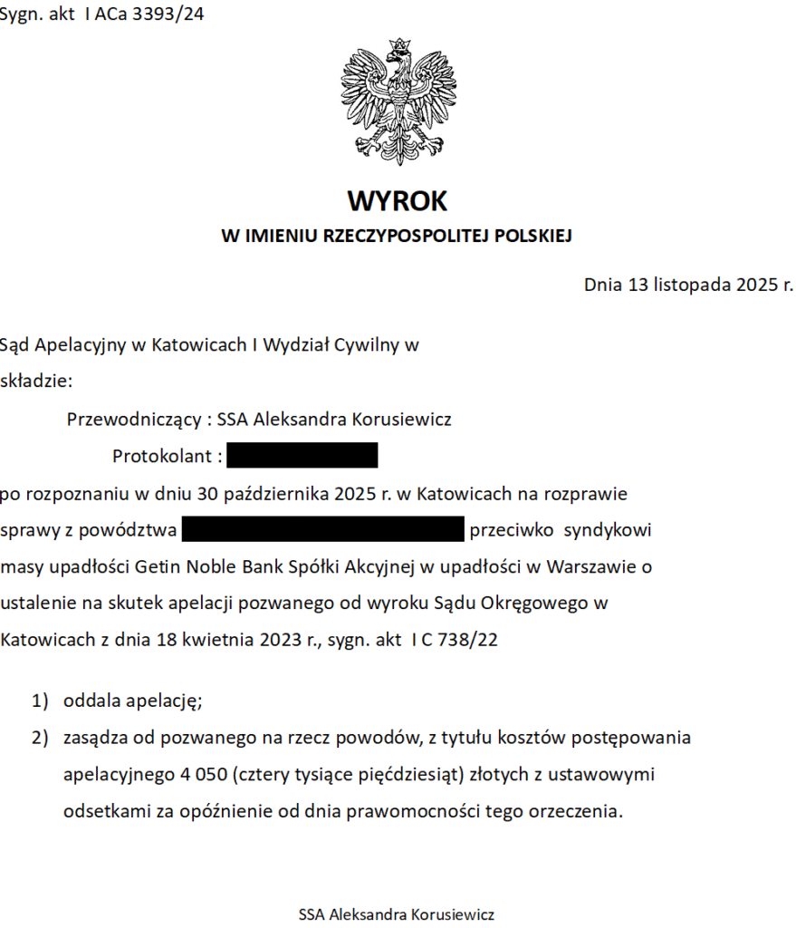 Lista wyroków frankowych w sprawach przeciwko GETIN Noble Bank S.A.
