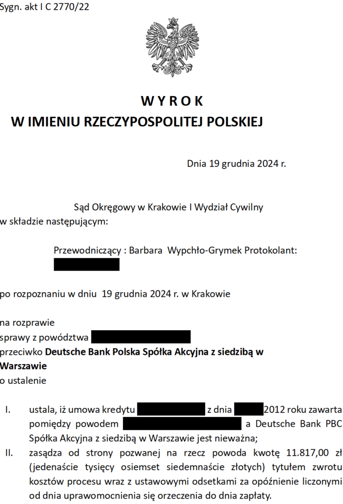 Dnia 19 grudnia 2024 r. Sąd Okręgowy w Krakowie, w sprawie o sygn. akt I C 2770/22 uznał, że kredyt EURO zawarty z Deutsche Bank z 2012 r. jest nieważny w całości.