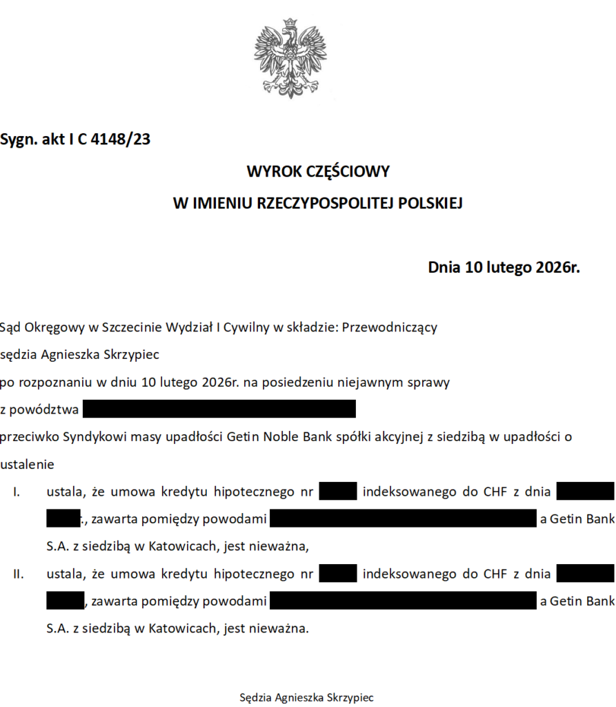 Na mocy wyroku Sądu Okręgowego w Szczecinie z dnia 10 lutego 2026 r., w sprawie I C 4148/23 doszło do unieważnienia dwóch kredytów zawartych z Getin Noble Bank S.A. (uprzednio: Getin Bank S.A. z siedzibą w Katowicach).