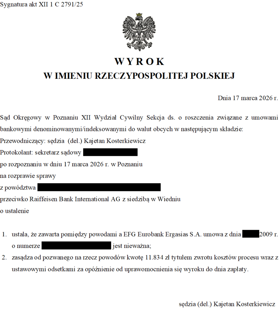 Wyrokiem z dnia 17 marca 2026 r., w sprawie o sygn. XII 1 C 2791/25 Sąd Okręgowy w Poznaniu unieważnił (ustalił nieważność) kredytu EURO z 2009 r. zawartego z EFG Eurobank Ergasias (obecnie Raiffeisen).