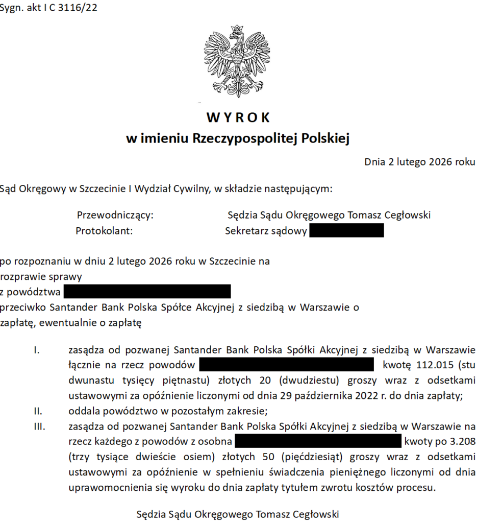 Na mocy wyroku Sądu Okręgowego w Szczecinie z dnia 2 lutego 2026 r., w sprawie I C 3116/22 doszło do unieważnienia spłaconego kredytu CHF zawartego z Kredyt Bank S.A. (obecnie Santander Bank Polska S.A.).