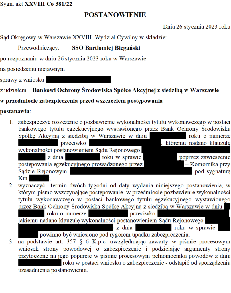Dnia 26 stycznia 2023 r. Sąd Okręgowy w Warszawie XXVIII Wydział Cywilny, w sprawie XXVIII Co 381/22 zabezpieczył roszczenie kredytobiorcy o pozbawienie bankowego tytułu wykonalności poprzez zawieszenie postępowania egzekucyjnego w sprawie kredytu EURO BOŚ Bank.