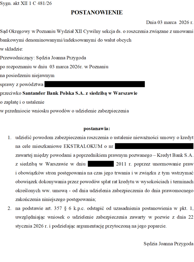 Dnia 22 grudnia 2025 r. Sąd Okręgowy w Poznaniu, w sprawie XII 1 C 481/26 wydał postanowienie, na mocy którego doszło do wstrzymania obowiązku kredytobiorców dokonywania dalszych spłat kredytu EURO zawartego z Kredyt Bank S.A. (obecnie Santander Bank Polska S.A.) z 2011 r.